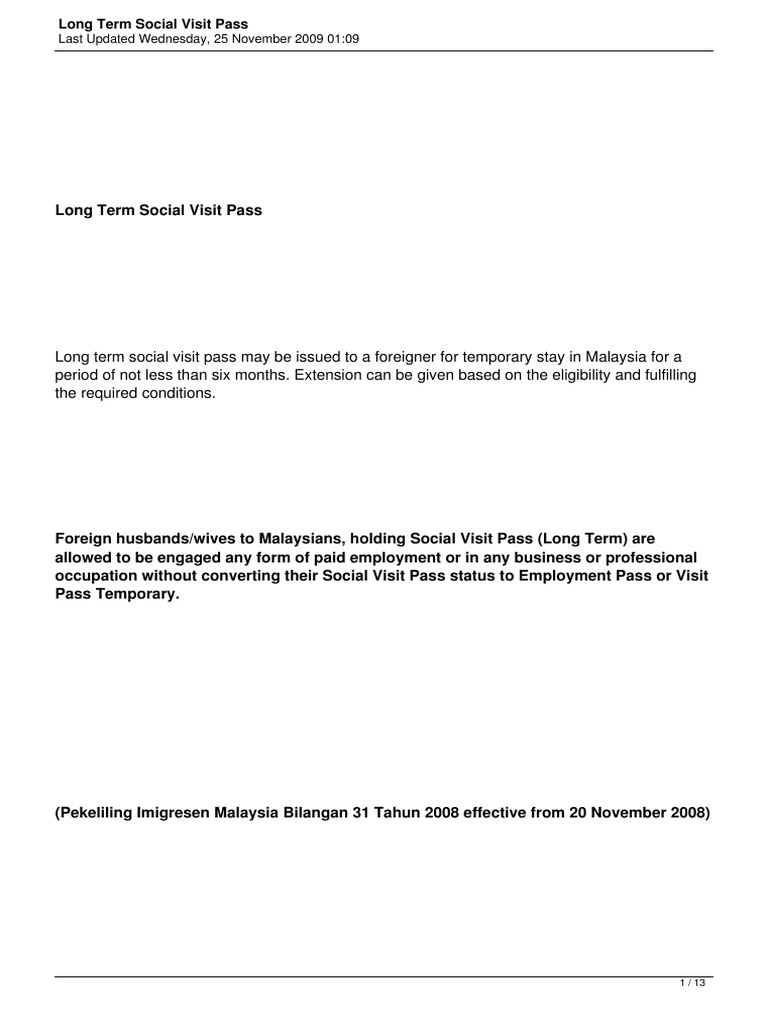 Sponsorship of Social Visit Pass from nus.edu.sg Foreign husbands/wives to malaysians can be given the social visit pass for a period of 5 years on condition that they comply with all the requirements. Citizens holding expired social visit passes should not expect to be able to freely depart malaysia without applying for prior approval with malaysian immigration and. I usually had about three months back in the uk in the warmer months ha ha ha if i could find any. However, there will not be any guarantee that you would be granted for 30 days extension, especially for the second extension. All foreign visitors entering malaysia through the gazetted entry points will be given social visit pass for social visit which including the following purposes Short term social visit pass: All visitors, who enter the country via any malaysian entry checkpoint, will be issued a short term social visit pass for any of the following reasons With this pass, they are permitted to provide services or undergo practical training with a malaysian company for up.