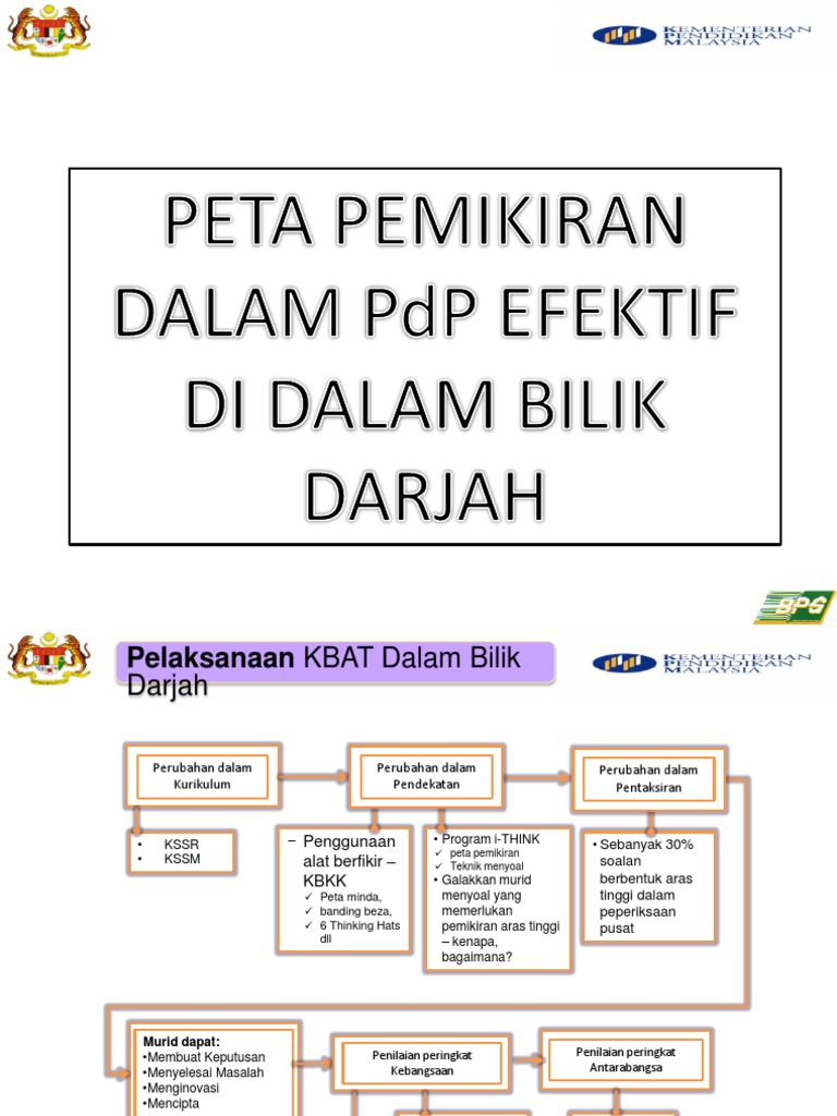 3.1 perancangan dan pelaksanaan kbat dalam pedagogi. Pembudayaan amalan komuniti pembelajaran profesional (plc). Bahagian e pelaksanaan kbat dalam pdp bil item skala 1 guru menggunakan alat berfikir dalam pdp. Pentaksiran bilik darjah (pbd) merupakan pentaksiran yang berterusan dalam sesi oleh itu, terdapat empat komponen dalam pbs iaitu pentaksiran pusat (pp), pentaksiran aktiviti jasmani, sukan & kokurikulum (pajsk), pentaksiran psikometrik (ppsi) dan pentaksiran bilik darjah (pbd). Murid diberi tugas ringkas mencipta alat perkusi 2.