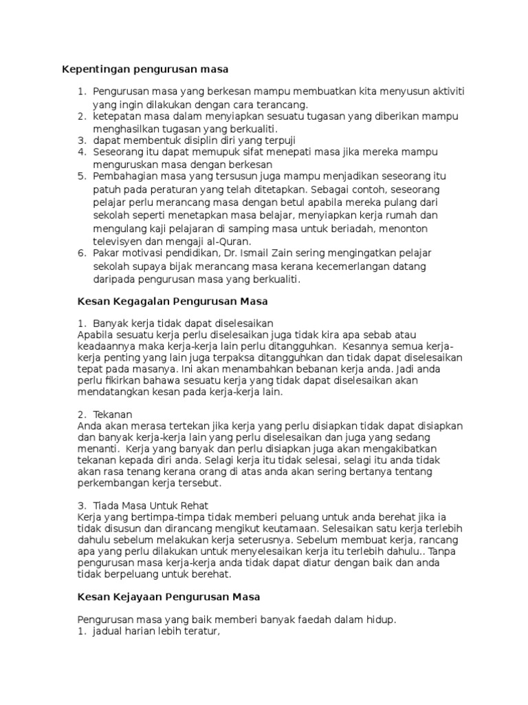 Akan berharga apabila ia menggunakan masa yang dilalui sepanjang kehidupannya dengan sebaik mungkin. Pengurusan masa yang buruk berlaku apabila anda menumpukan terlalu banyak kerja yang kurang penting dalam masa yang tidak menentu. Pengurusan masa yang efektif adalah pengurusan masa yang menitikberatkan gambaran yang lebih luas dan pencapaian objektif berjangka panjang. Masa tidak dapat dikawal tetapi masa boleh diuruskan dengan baik. Makagunakan waktu pagi untuk menyiapkan persediaan mengajar. Katalah, tugas penting kita ialah menyiapkan persediaanmengajar dan prime time kita ialah waktu pagi. Pengurusan masa merupakan suatu elemen kehidupan yang sangat penting. Pengurusan masa sebenarnya sangat membantu dalam kehidupan harian dan membantu menentukan perkara yang sepatutnya dilakukan terlebih dahulu. Setiap manusia dikurniakan 24 jam dalam sehari. Mengarah kumpulan manusia dan terlibat dalam 4. Sediakan buku log atau buku nota dan bawa ia kemana sahaja anda pergi. Pihak pengurusan adalah penggerak organisasi. Pengurusan masa yang berkesan menggambarkan kepada pengurusan kehidupan yang lebih baik untuk masa akan datang.